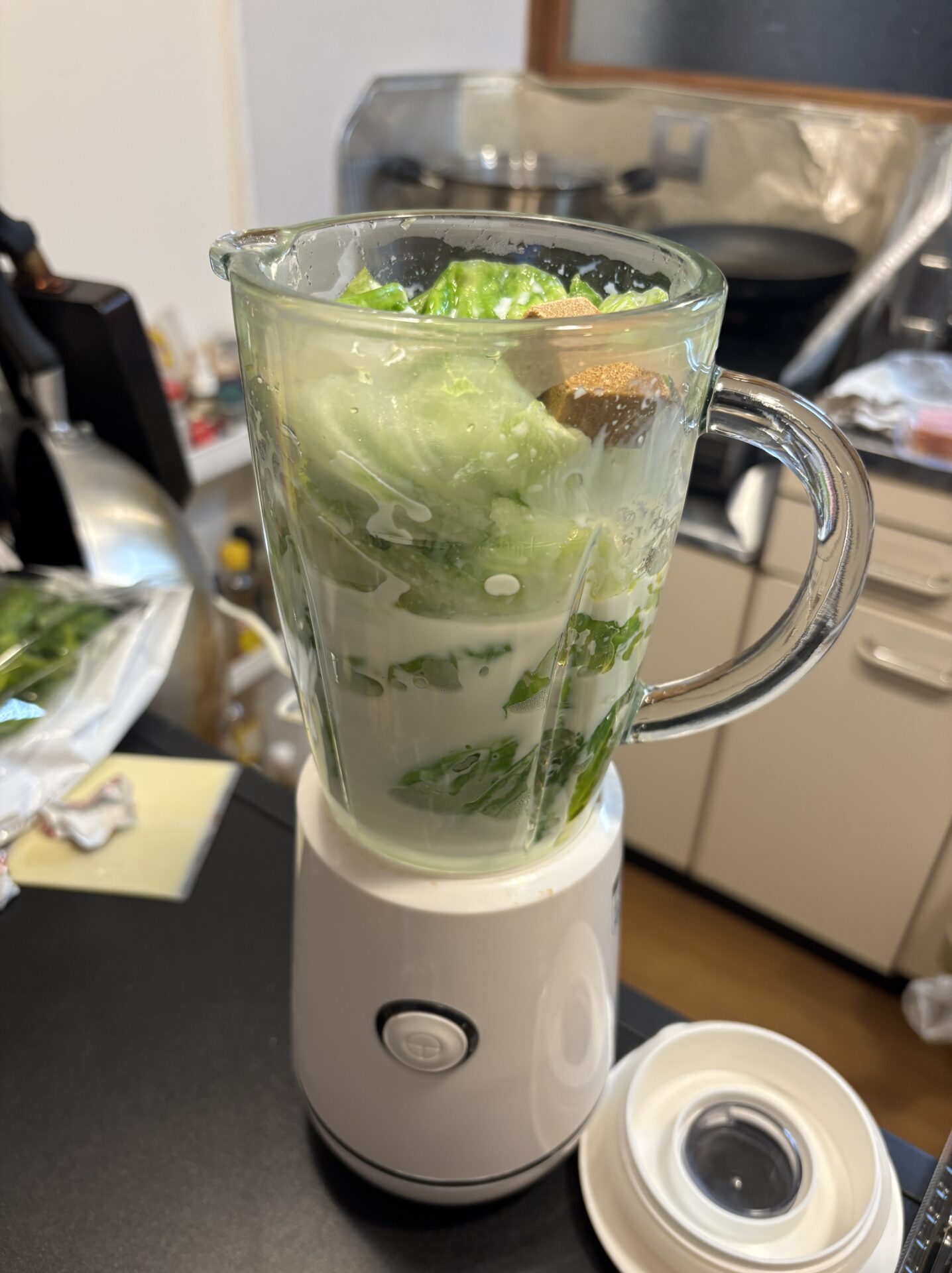 レタス1/4〜1/2個をラップをかけて電子レンジで2分(または湯通し1分)加熱する。(加熱することでしんなりし、ミキサーで混ぜやすくなります)