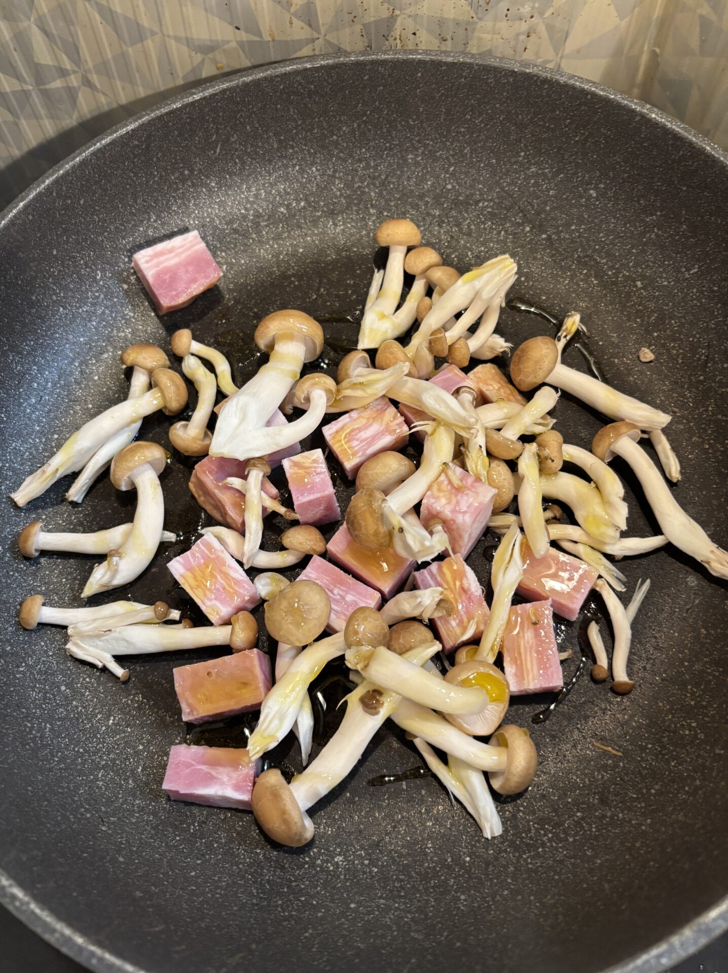 フライパンにオリーブオイル、ニンニクを入れ少し炒めた後、ベーコン、しめじを焼き色が少しつくまで炒める。
